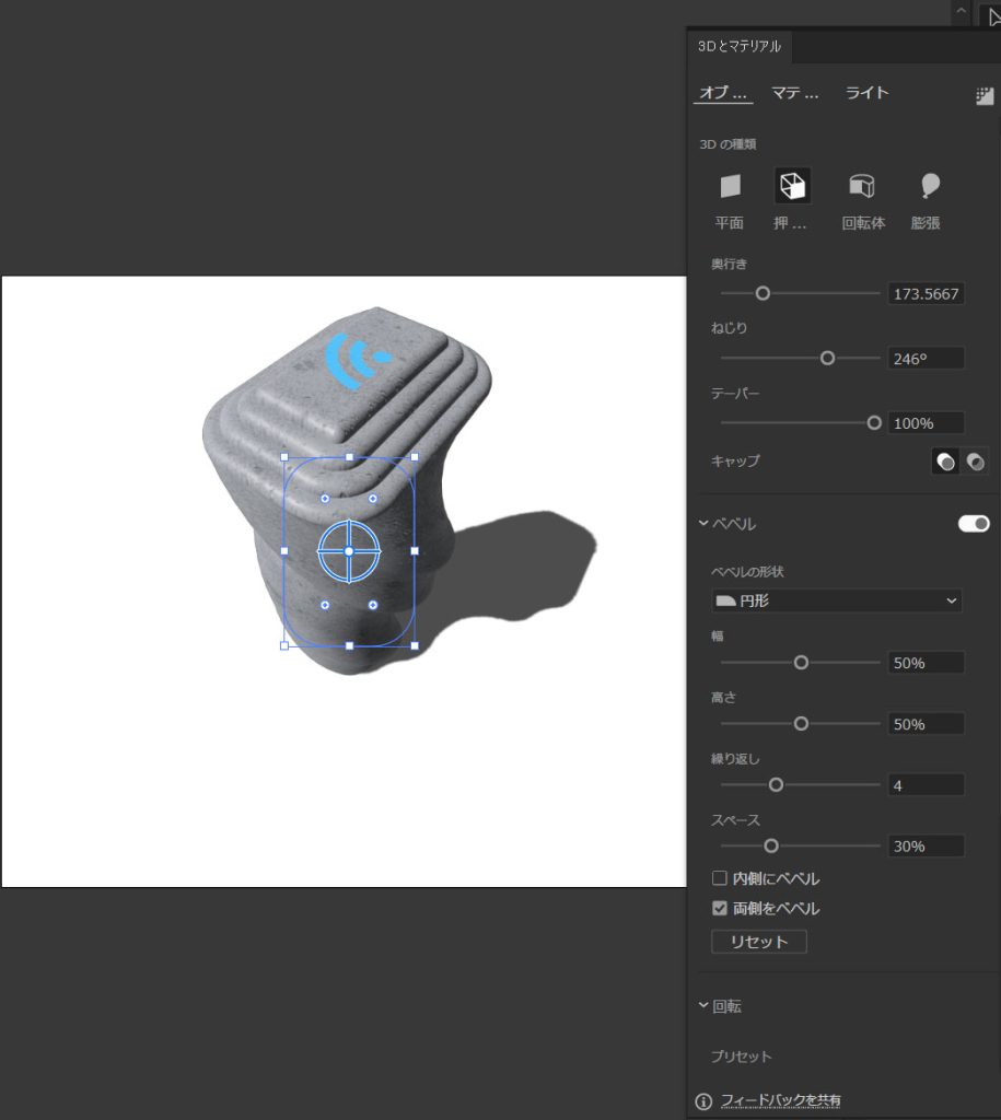 Photoshopの3Dのように、ひねりやテーパーを加えたり、ベベルを複数つけたり、最新版では色々アレンジをし様々なパーツとして書き出してDimensionで組み上げることもできるので、Adobeソフトだけで3D表現のハードルが一気に下がった印象です。